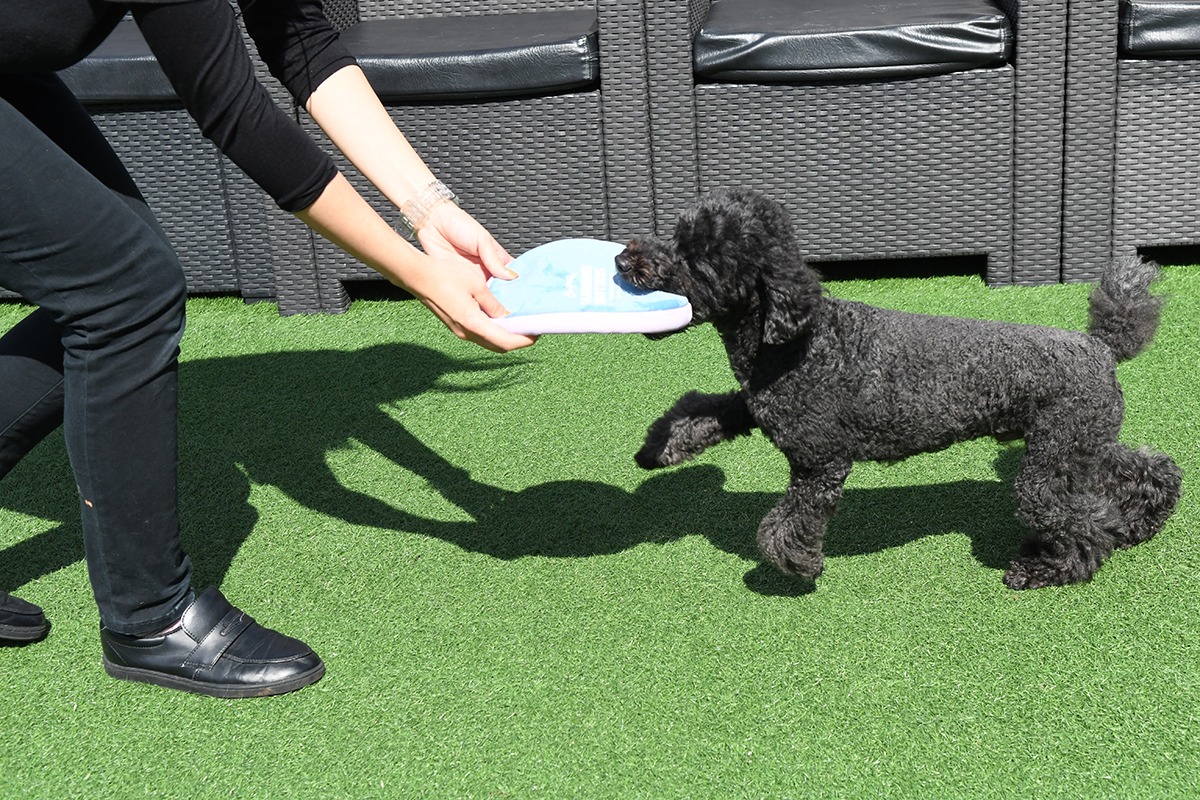 2~3mの距離で確実にキャッチできるようになったら、徐々に距離を伸ばしていき、キャッチしたディスクを持ってきて放すまでを繰り返します。上手にできたら褒め、飽きる前に休憩しましょう。