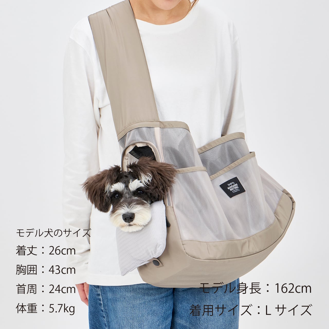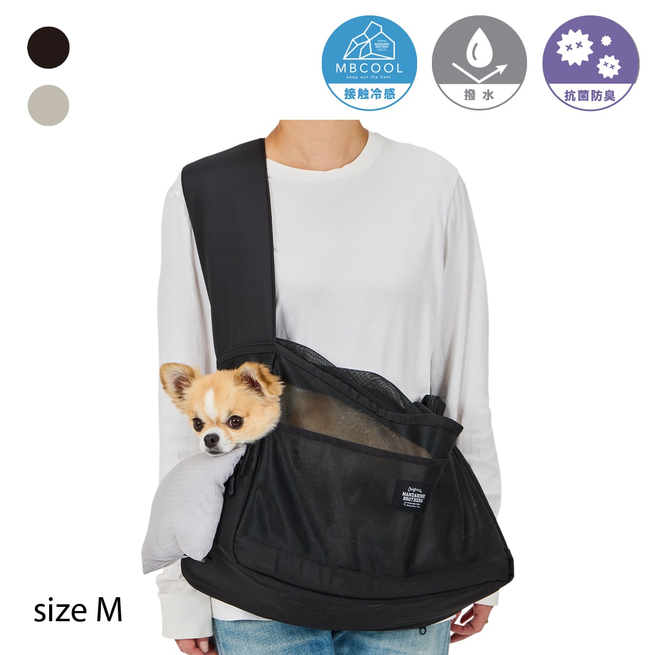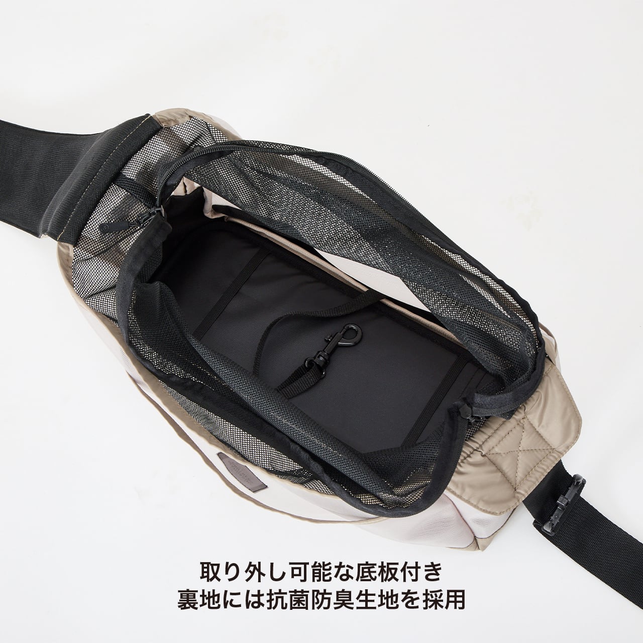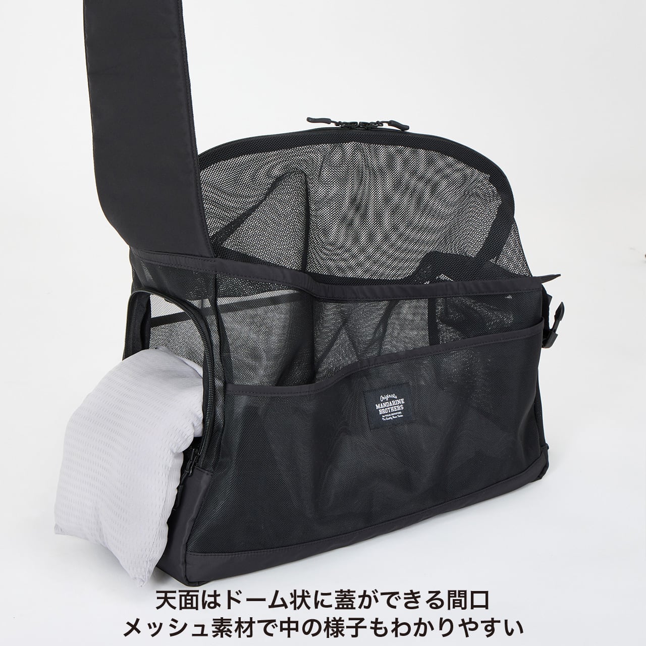 軽くて通気性の良いオールメッシュのショルダーバッグ。サイドから顔を出せる小窓とひんやり素材のあご乗せクッション付き。