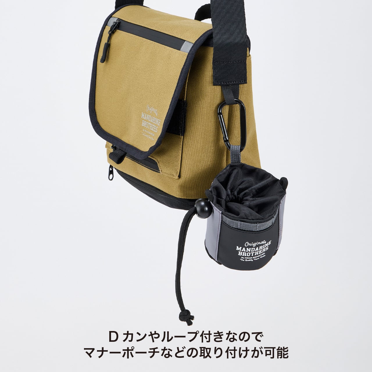 ・小物やポーチ等をフック掛けできるDカンやループ付属