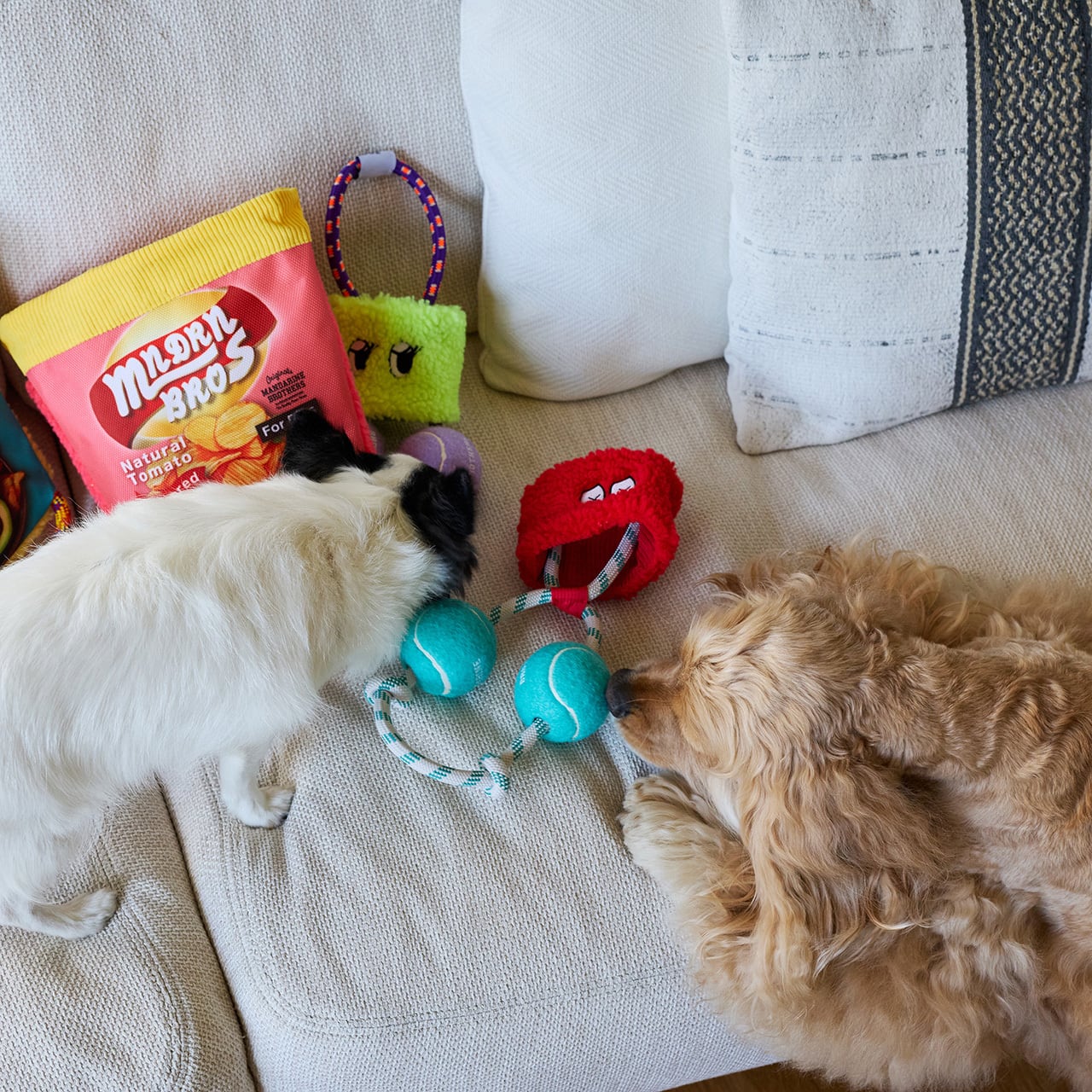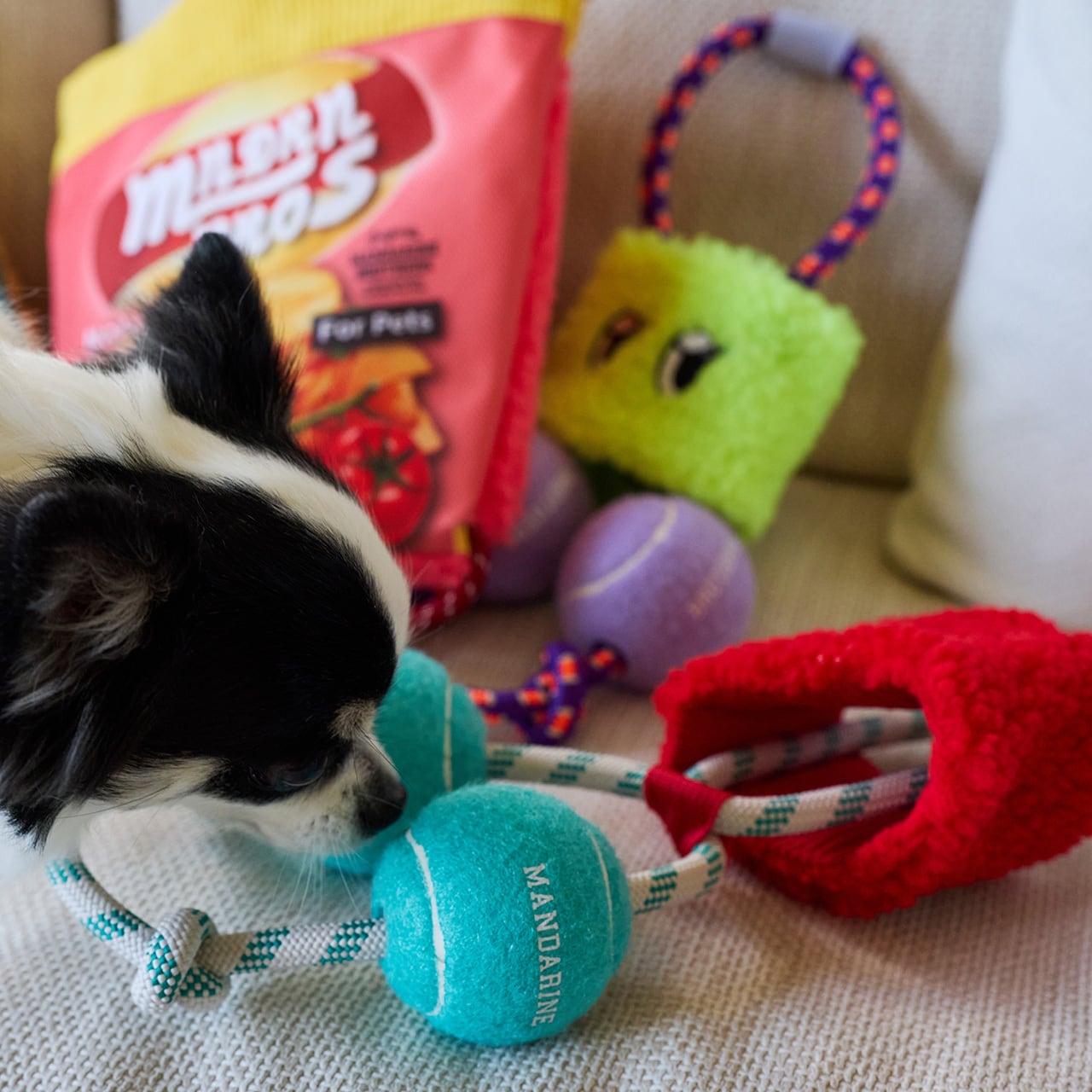 ワンちゃんが大好きなテニスボールトイにパリパリボアをプラスしてブースト!