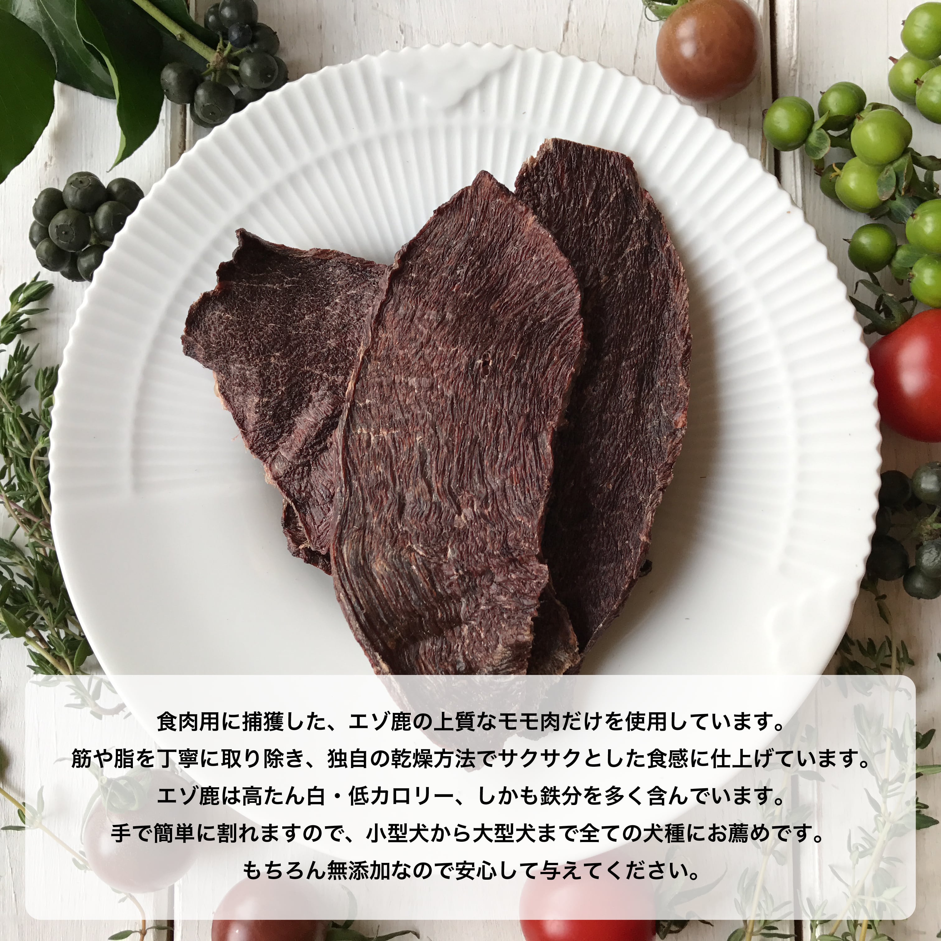 原材料:北海道産エゾ鹿もも肉(添加物不使用)