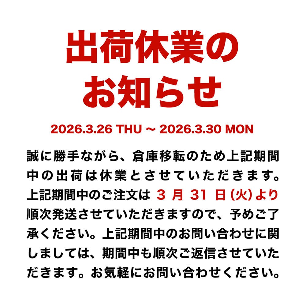 誠に勝手ながら、倉庫移転のため上記期間中の出荷は休業とさせていただきます。